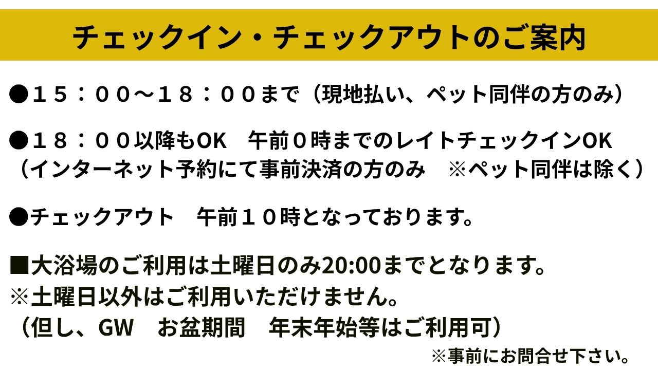 チェックイン・チェックアウトのご案内、大浴場についてもご案内しております。