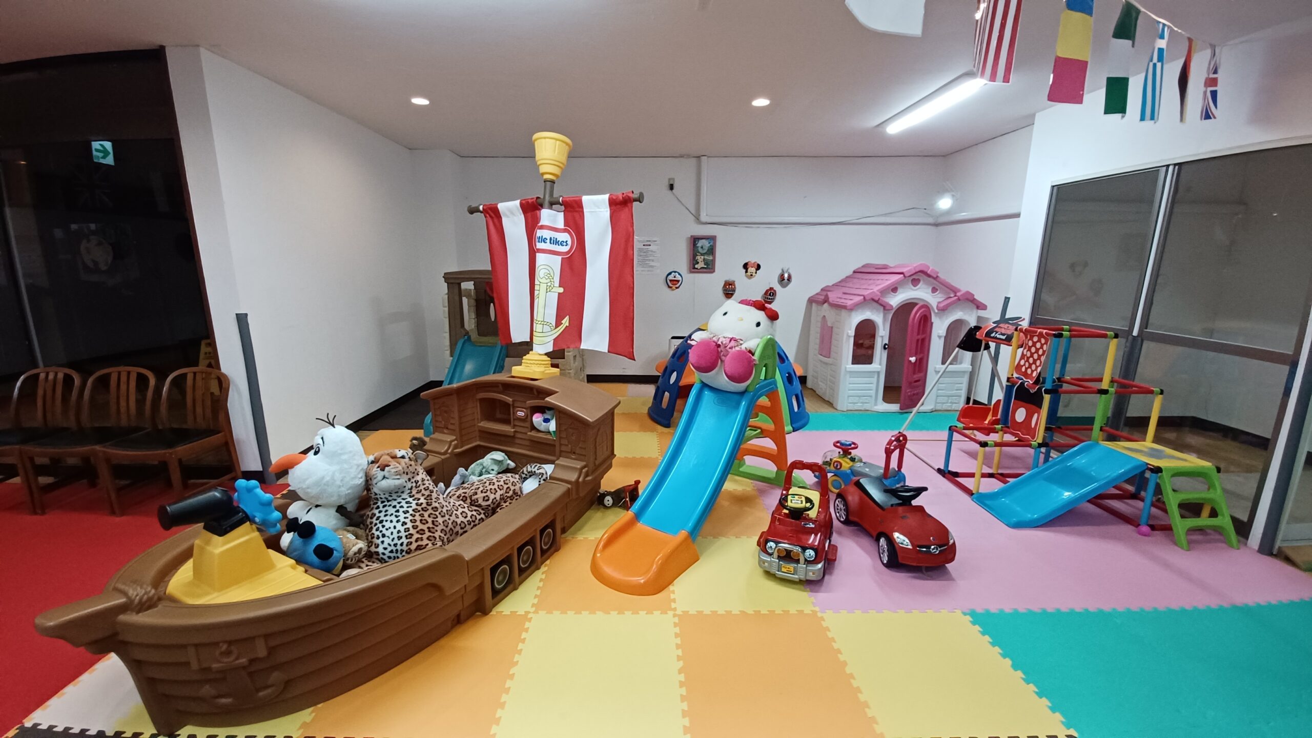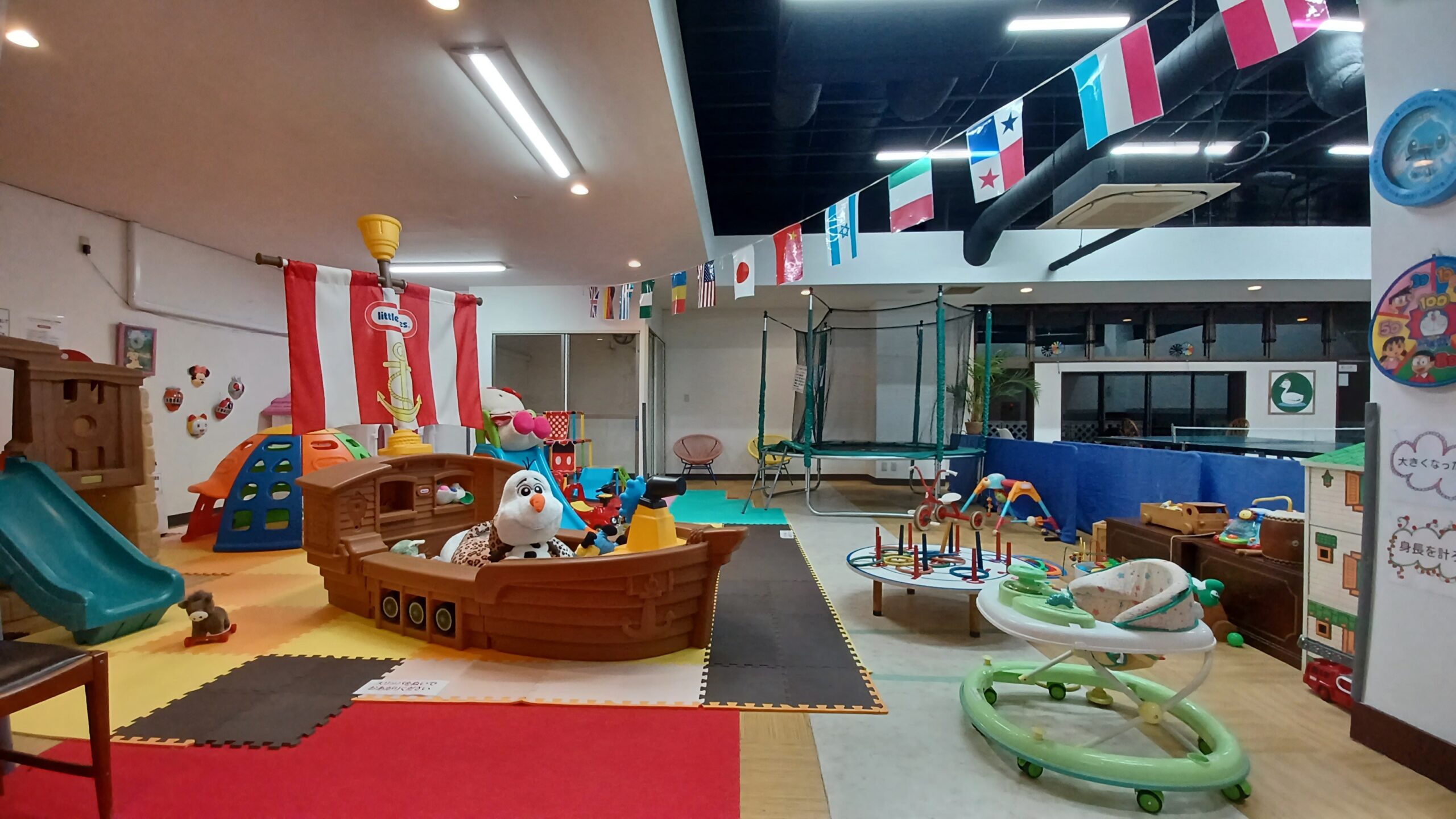 キッズコーナーは、幼児のお子様から遊べるよう、らくがきコーナー・トランポリン・滑り台・ミニハウス等がございます。